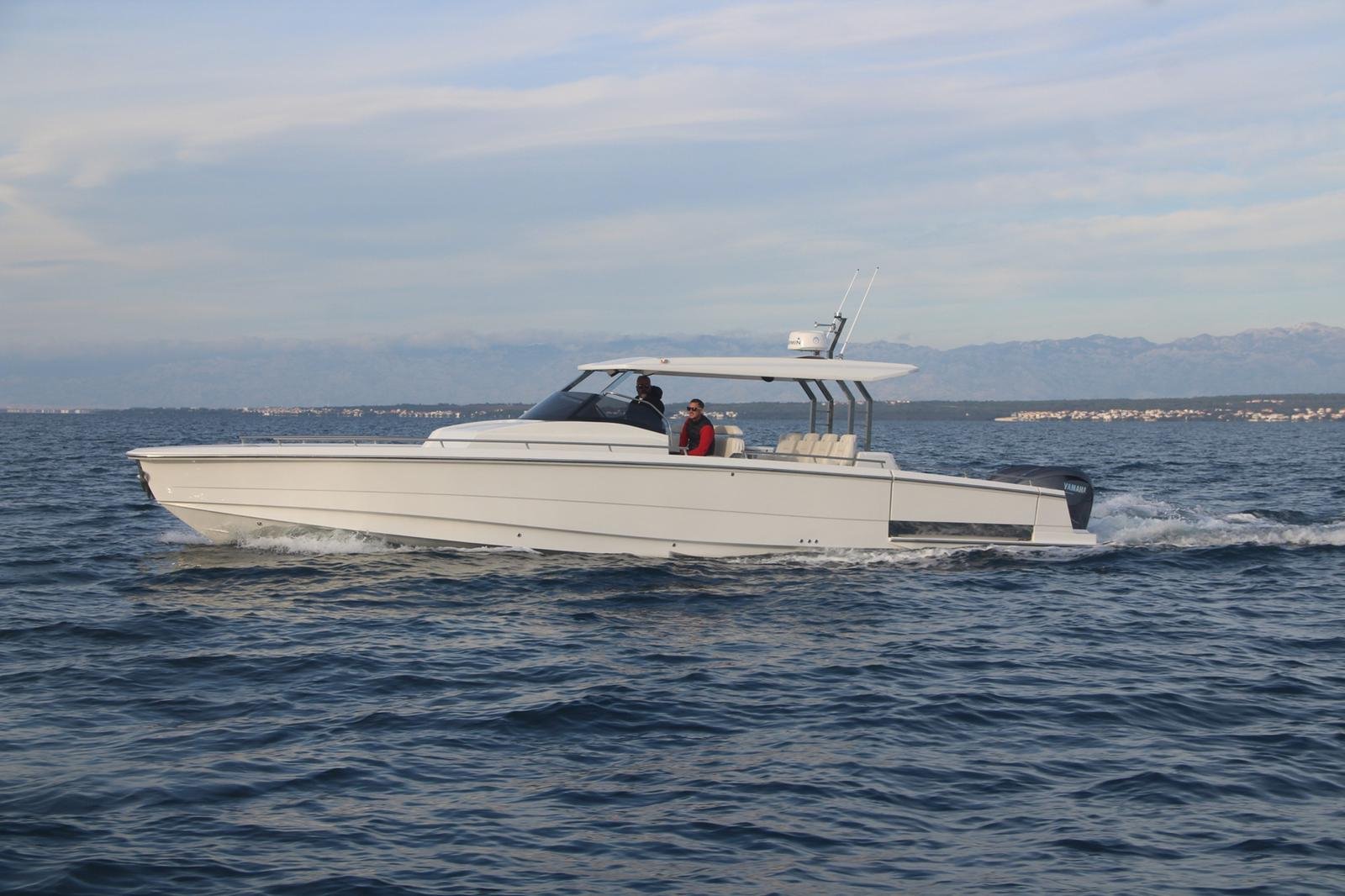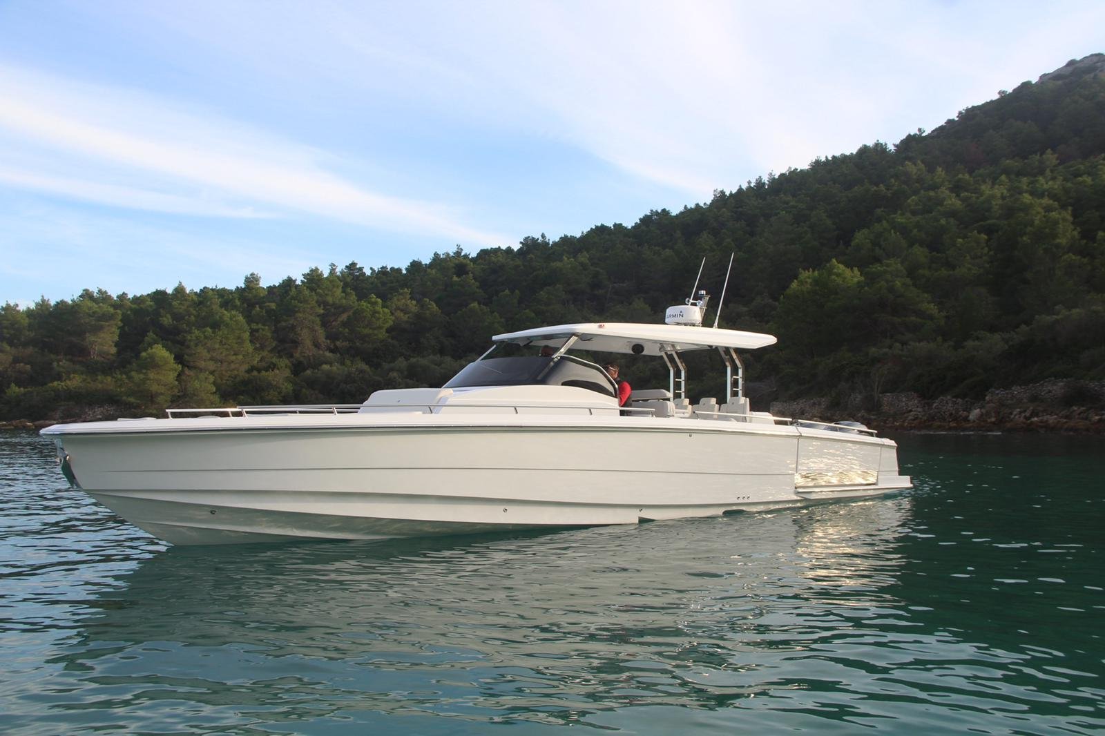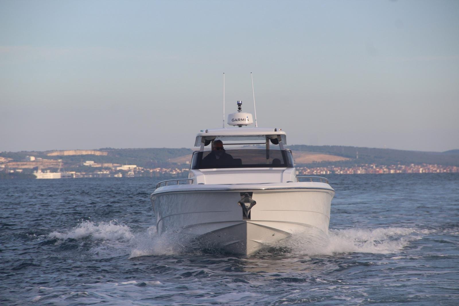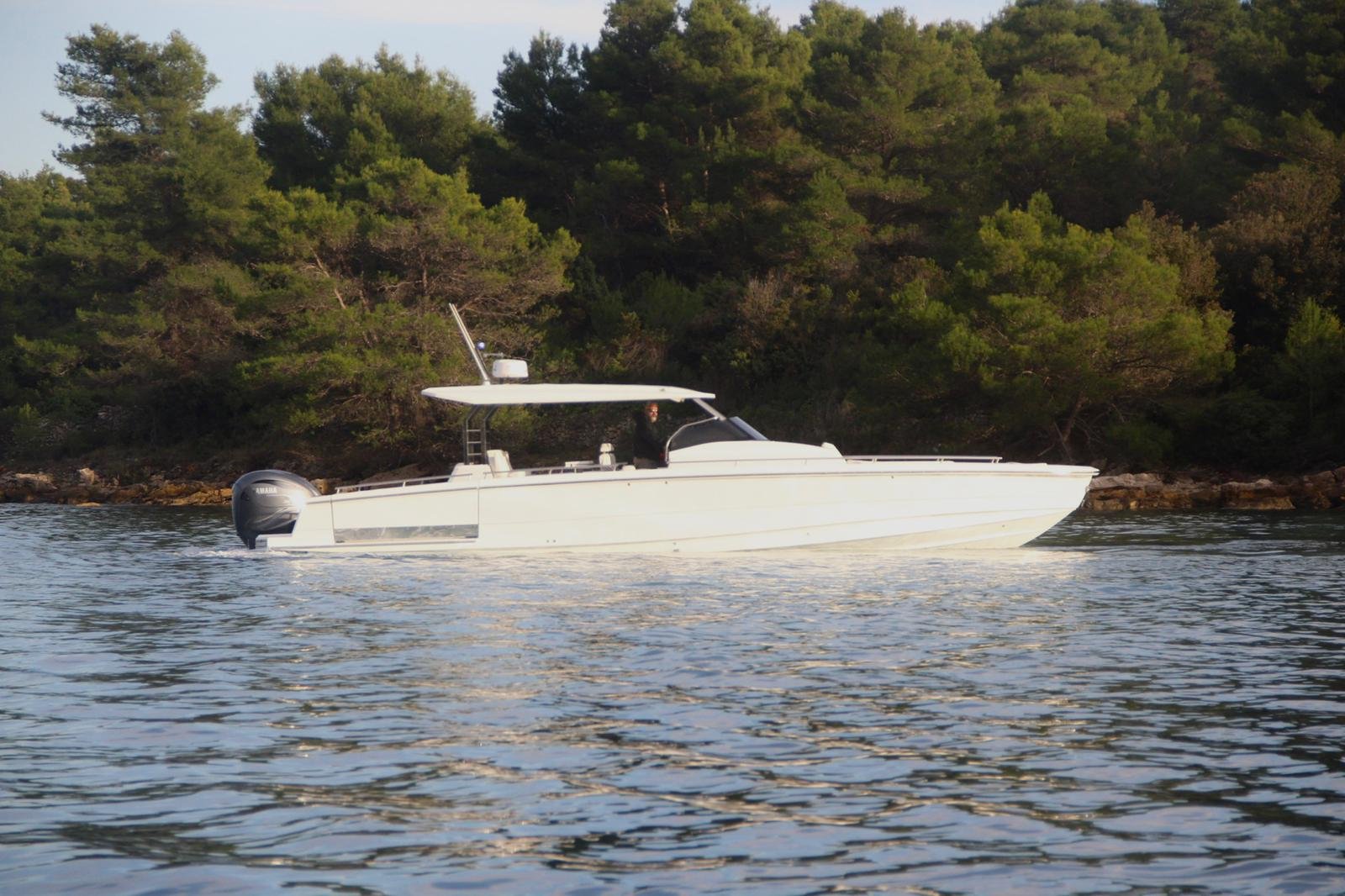 A typical modern big dayboat, suitable for yacht tenders. From the concept sketches to the prototype in twelve months. Handmade lamination (higher weight), a very fast boat, remarkable performance. Excellent communication with the customer who had never been in manufacturing but had been in yachting for years. Some styling details are not our first choice. The stepped hull tends to be more challenging than the classic fast boat hull forms due to tiny details affecting the efficiency of the hull. Small mistakes can cause big problems at high speeds. Our knowledge of ship hydrodynamics proved to be more than theoretical.